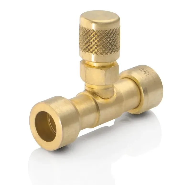 Złączka mosiężna do rurek Ø9,53 mm z zaworem Schradera.