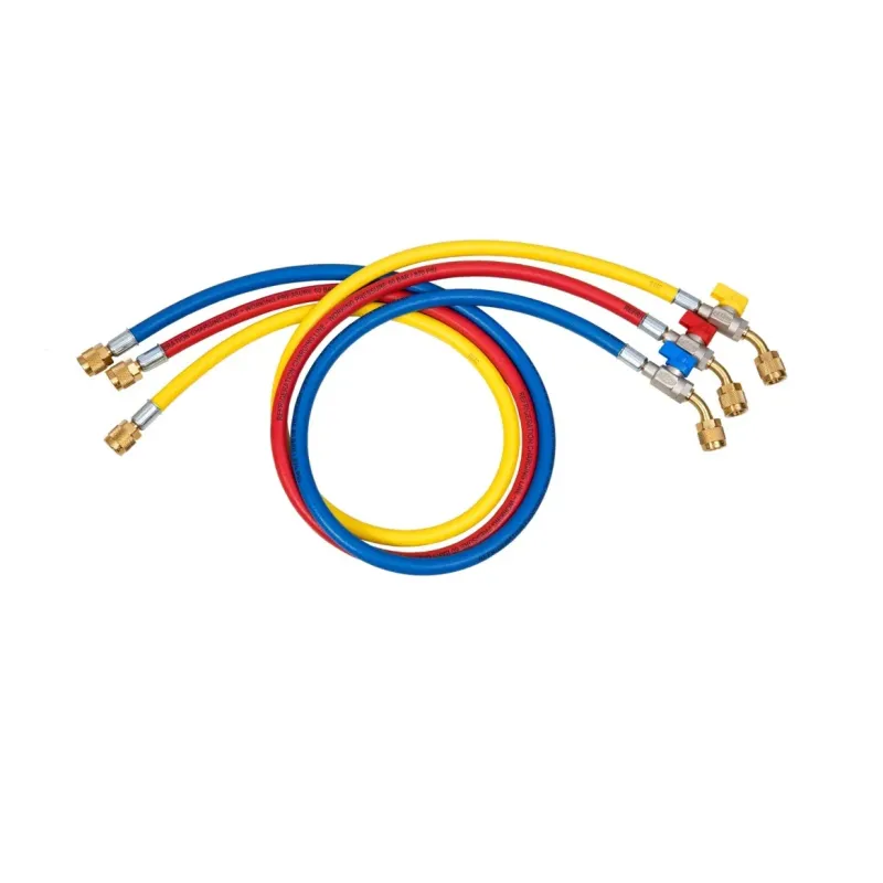Komplet przewodów z gwintami 1/4″SAE oraz zaworem kulowym wygiętym pod kątem 45 stopni.