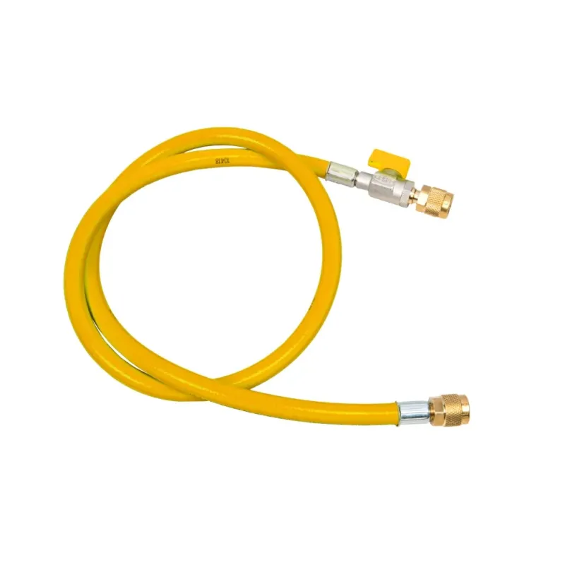 Wąż do napełniania, żółty, z zaworem kulowym, 1/4″ SAE, 72″/180 cm 1x prosty 1/4″ SAE, 1x prosty z zaworem kulowym 1/4″ SAE i popychaczem rdzenia/wentyla.